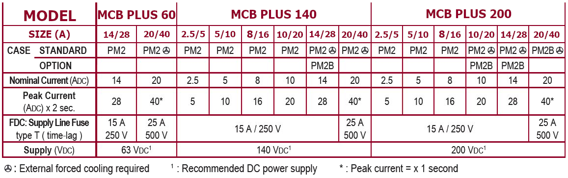 Power supply from 24 to 200 VDC with output current up to 20 Amps continuous / 40 Amps peak. Tacho-generator, armature, current mode and encoder feedback can be specified.