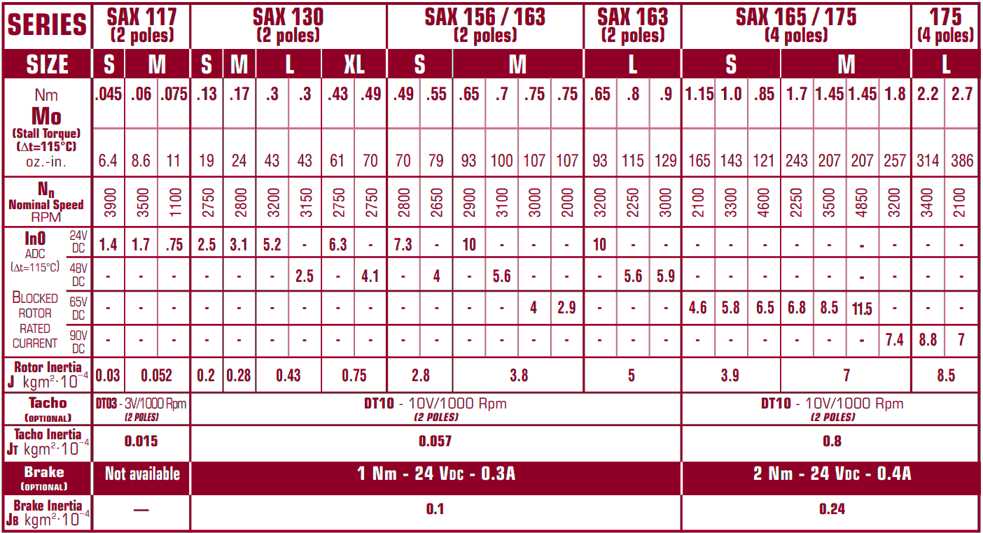 SAX DC servo motors with permanent magnets are traditional, easy-to-use, motors that are extremely reliable and efficient. They have a favourable cost to performance ratio and are perfectly designed for use with the Microspeed, Minispeed and Masterspeed Servo Amplifiers and range from 0.045 to 2.7Nm.
