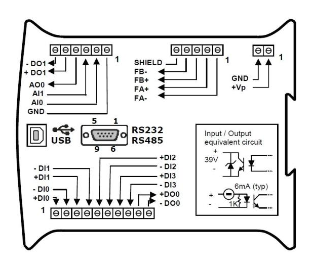 - 4 digital and 2 +/-10V analog inputs